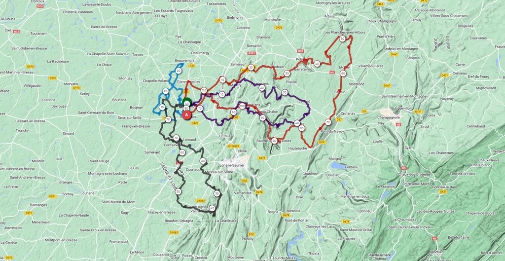 Au Nord-Est, vous traverserez de grandes forêts en vous dirigeant en direction d'Arbois. Vous aurez peut-être même l'occasion de surplomber les reculées des Planches et de jouir de magnifiques panoramas si vous êtes endurant (env. 120 km). Le retour se fera le long des contreforts du Jura.